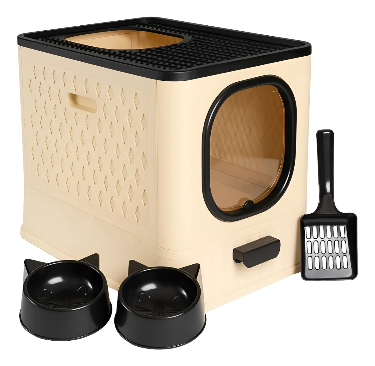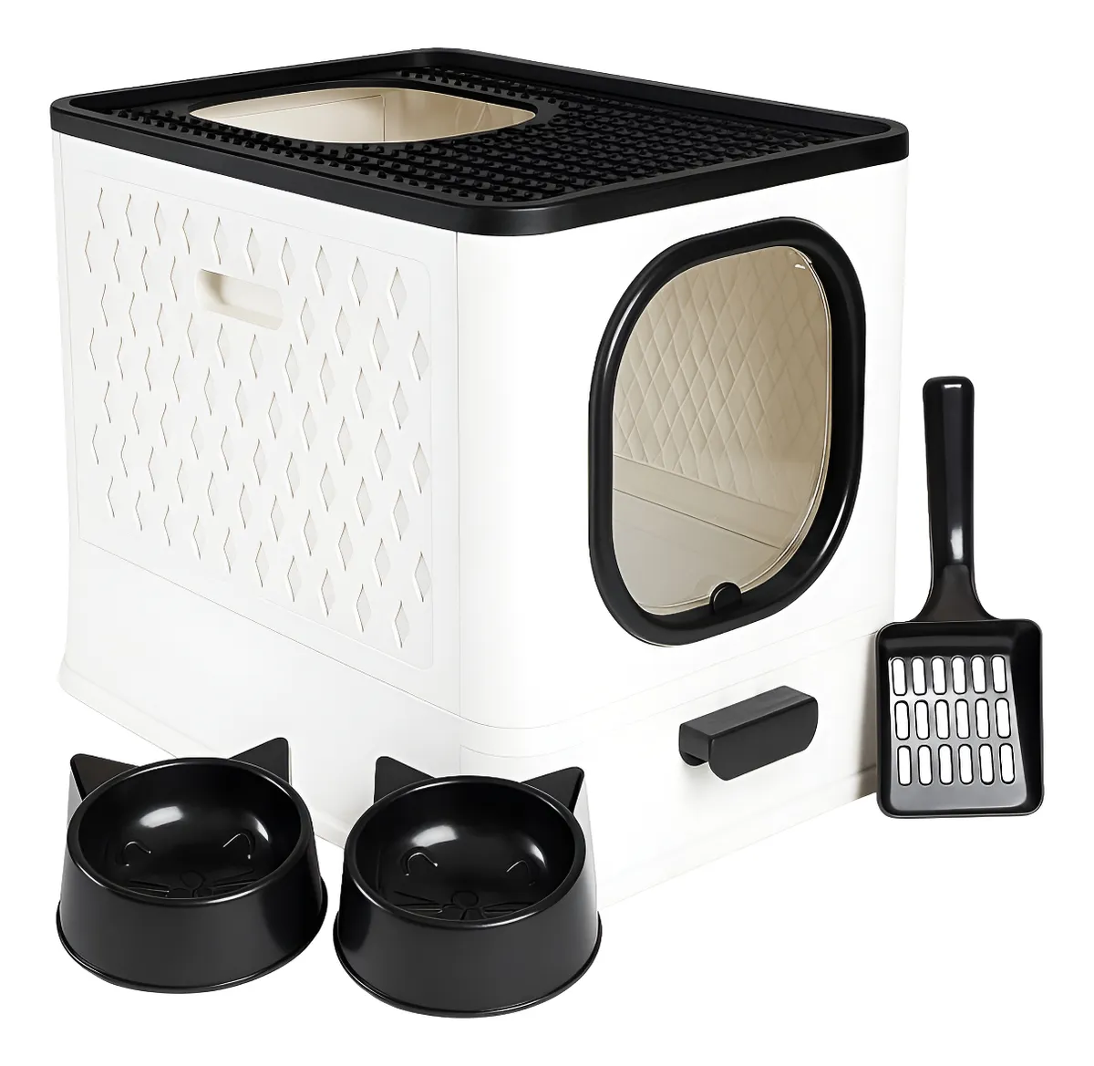 O principal diferencial é seu design com entrada superior e uma grade na saída, que ajuda a limpar as patas do gato, evitando que ele espalhe areia pela casa. Além disso, possui bandeja removível e filtro antiodor.