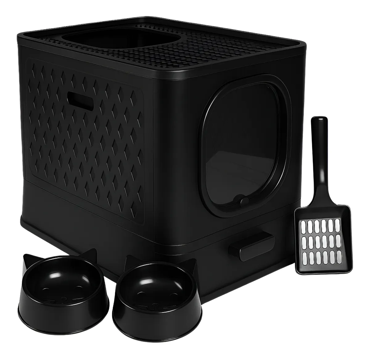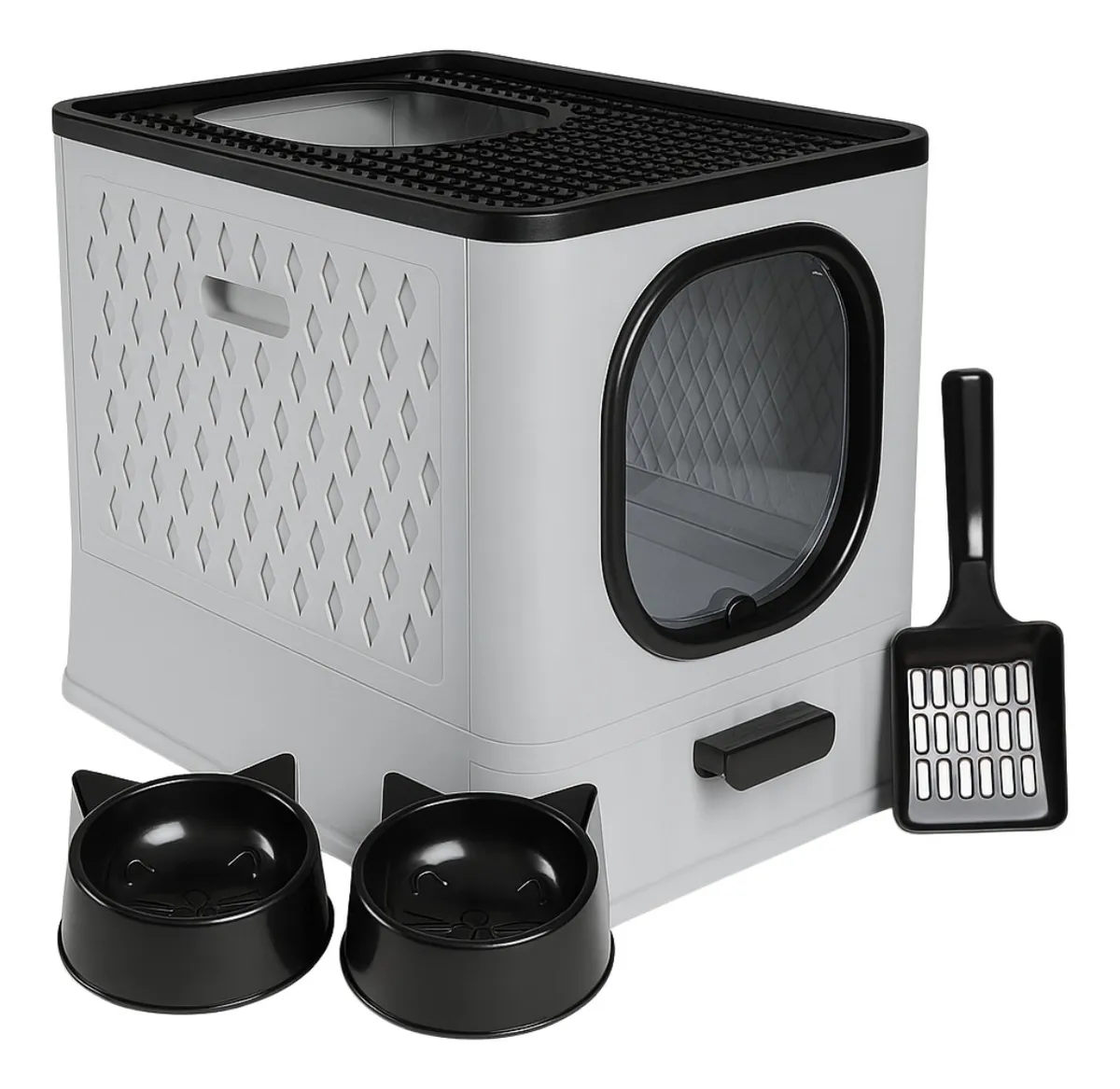 O design inovador com entrada superior foi pensado para o conforto total do seu gato, enquanto a saída por cima, com uma grade especial, evita que a areia se espalhe pela casa, ajudando o pet a limpar as patinhas naturalmente.